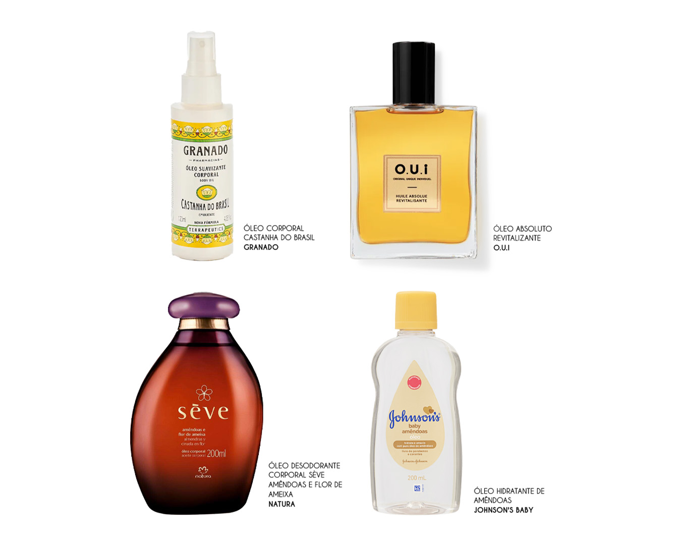 Antes de sair do chuveiro, cubra o corpo com um óleo hidratante — e aqui vai uma dica: não enxague o produto! É só se secar normalmente com a toalha.