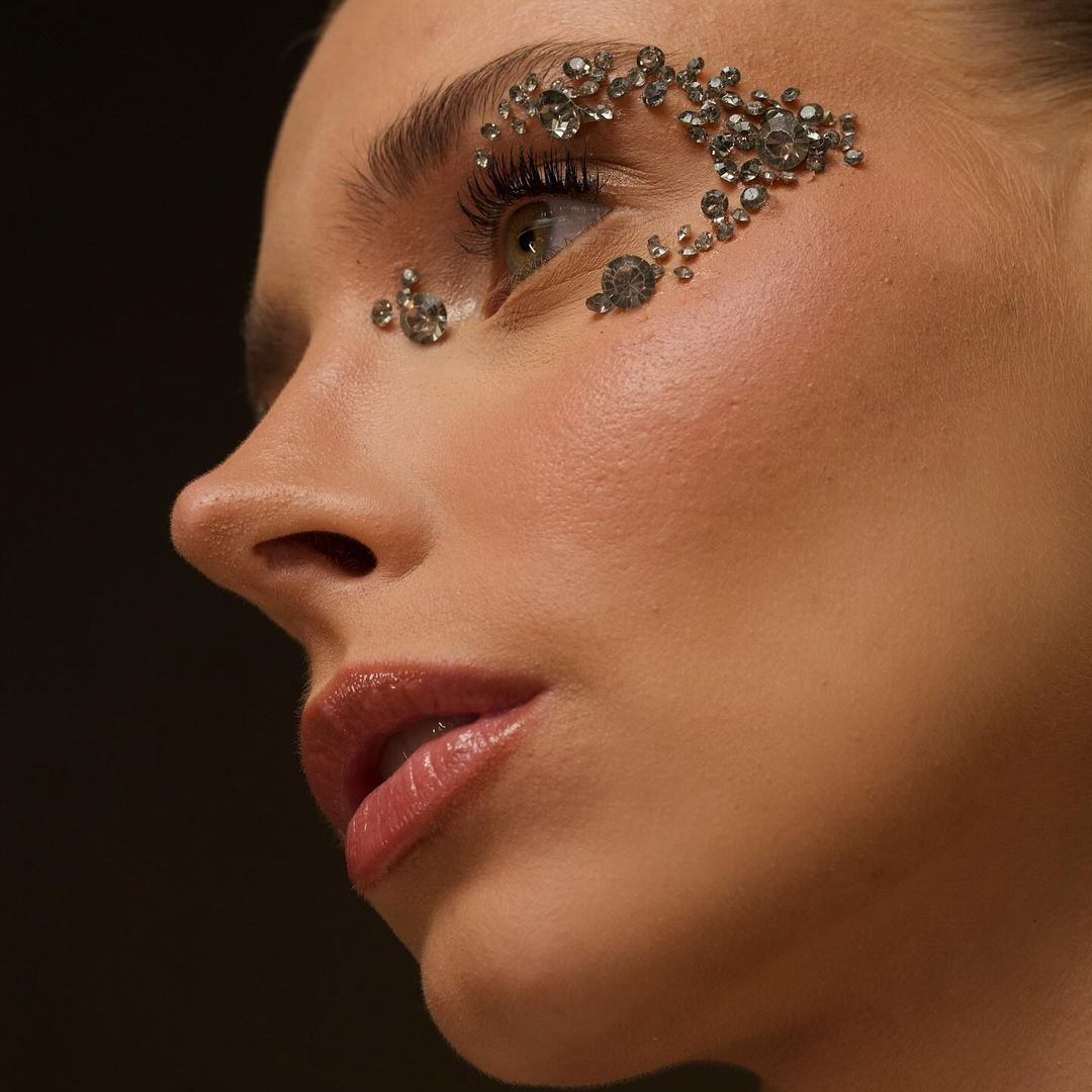 Uma das belezas mais recentes que a Lu compartilhou foi uma produção prateada para Betina Klotz. A ideia foi criar uma joia no rosto da influenciadora, como se fossem diamantes cravejados. Carnavalesca chic, né?