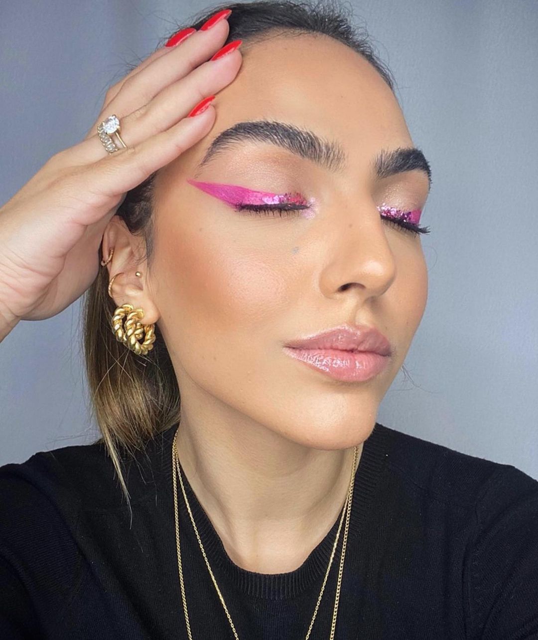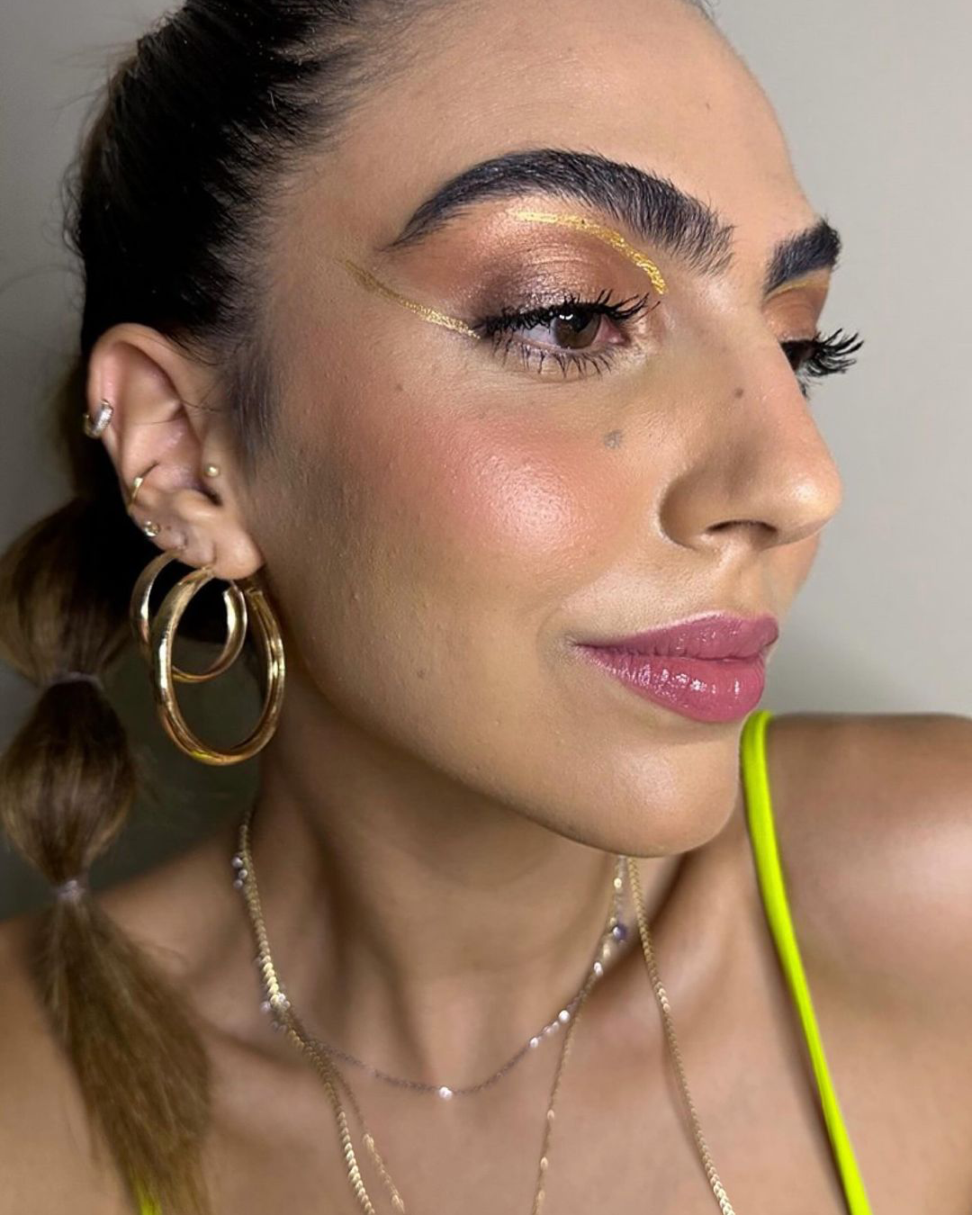 Se a cor é a essência do Carnaval, esse é o momento de caprichar nos tons chamativos. As sombras líquidas ajudam a destacar a pigmentação, e, lá no seu Insta, a maquiadora já ensinou a criar produções usando esse item tão prático.