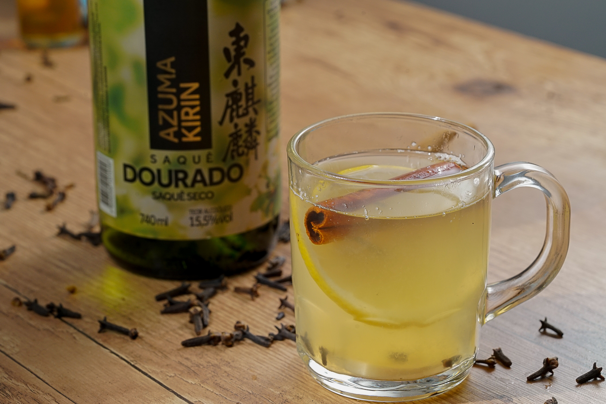 Modo de preparo: coloque o suco de limão e o mel no copo. Aqueça o sake, mas cuidado para não ferver. Despeje o sake aquecido no copo e misture até o mel se dissolver. Decore com canela em pau e rodela de limão. Adicione fatias de gengibre a gosto.