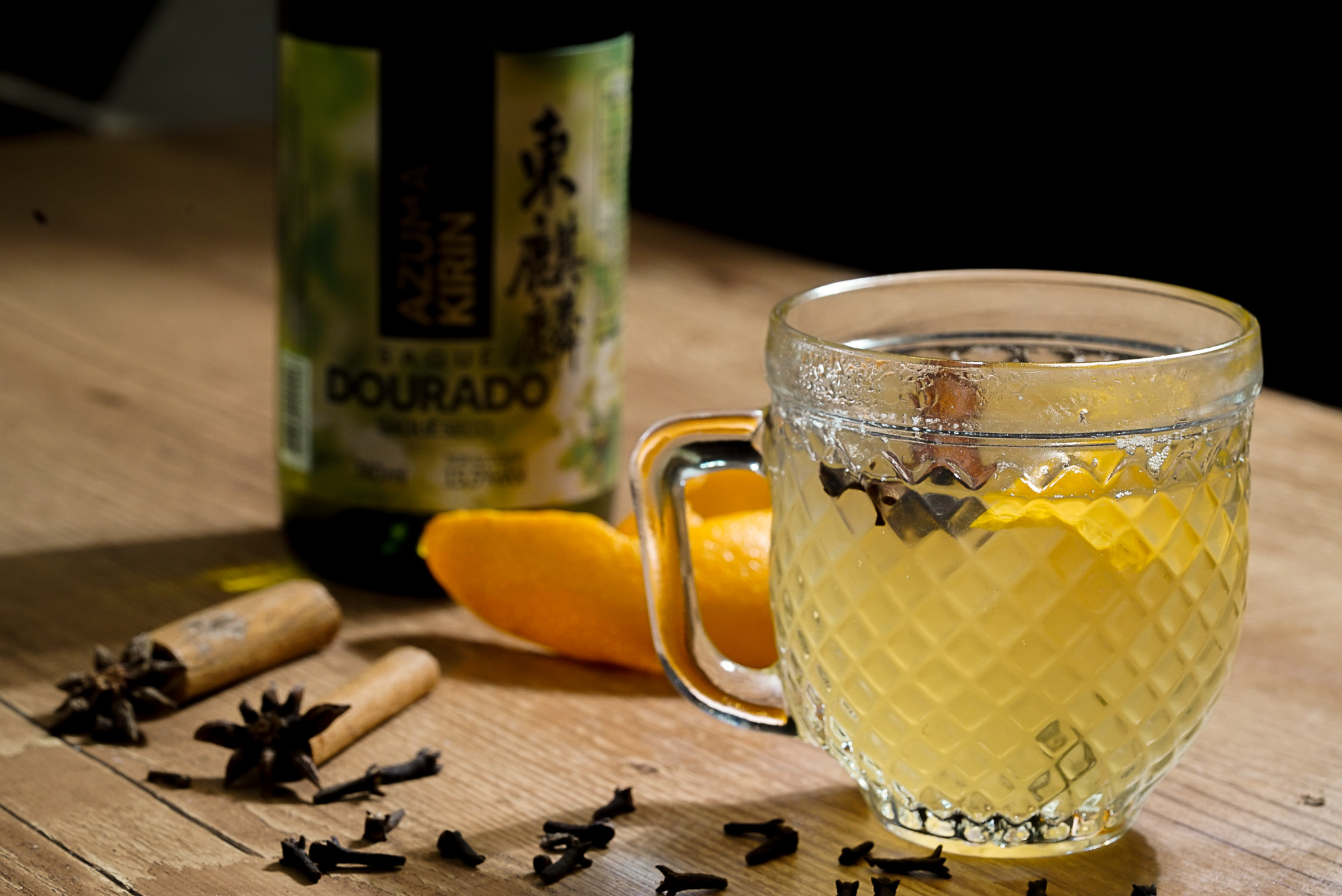 Modo de preparo: em uma panela, coloque o açúcar, as cascas de laranja e de limão, o gengibre, a canela e o cravo a gosto. Quando o açúcar estiver começando a derreter, adicione água e deixe cozinhar em fogo baixo de 5 a 10 minutos. Adicione o sake e deixe aquecer delicadamente, mas cuidado para não ferver