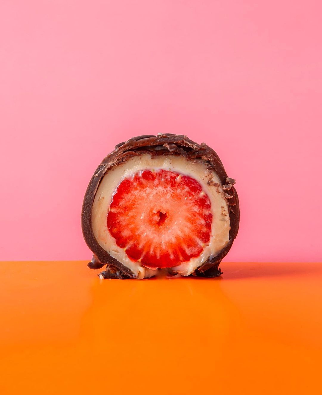 Com casca de chocolate 51% sem leite e sem açúcar, o bombom é feito com um blend de adoçantes, manteiga de cacau e morango. Atualmente, além da entrega via delivery, ele está sendo vendido no Empório Frutaria.