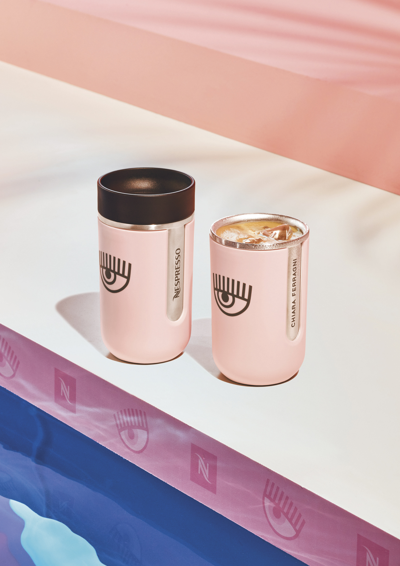 Aqui no Brasil, o acessório escolhido para celebrar a parceria foi a Caneca Térmica NOMAD Nespresso x Chiara Ferragni – inspirada na estética contemporânea e alegre que a própria Chiara aplica em seu cotidiano e em sua marca pessoal. O acessório é apresentado em um tom apelidado de “Blooming Rose”, um delicado rosa pastel com a gravura icônica dos olhos azuis de Chiara, sua marca registrada.