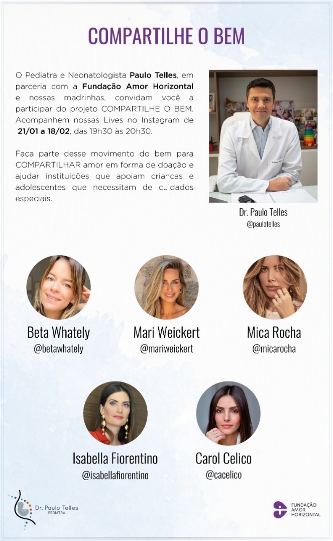 Fundação Amor Horizontal, Carol Celico e Dr. Paulo Telles prepararam o projeto Compartilhe o Bem, uma programação com cinco lives sobre maternidade e saúde da criança, incentivando doações para o terceiro setor (ONGs parceiras da Fundação Amor Horizontal).