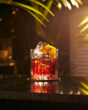 Modo de preparo: Em um copo baixo previamente resfriado e com gelo, acrescente todos os ingredientes e mexa por até 20 segundos. Decore com uma casca de laranja.