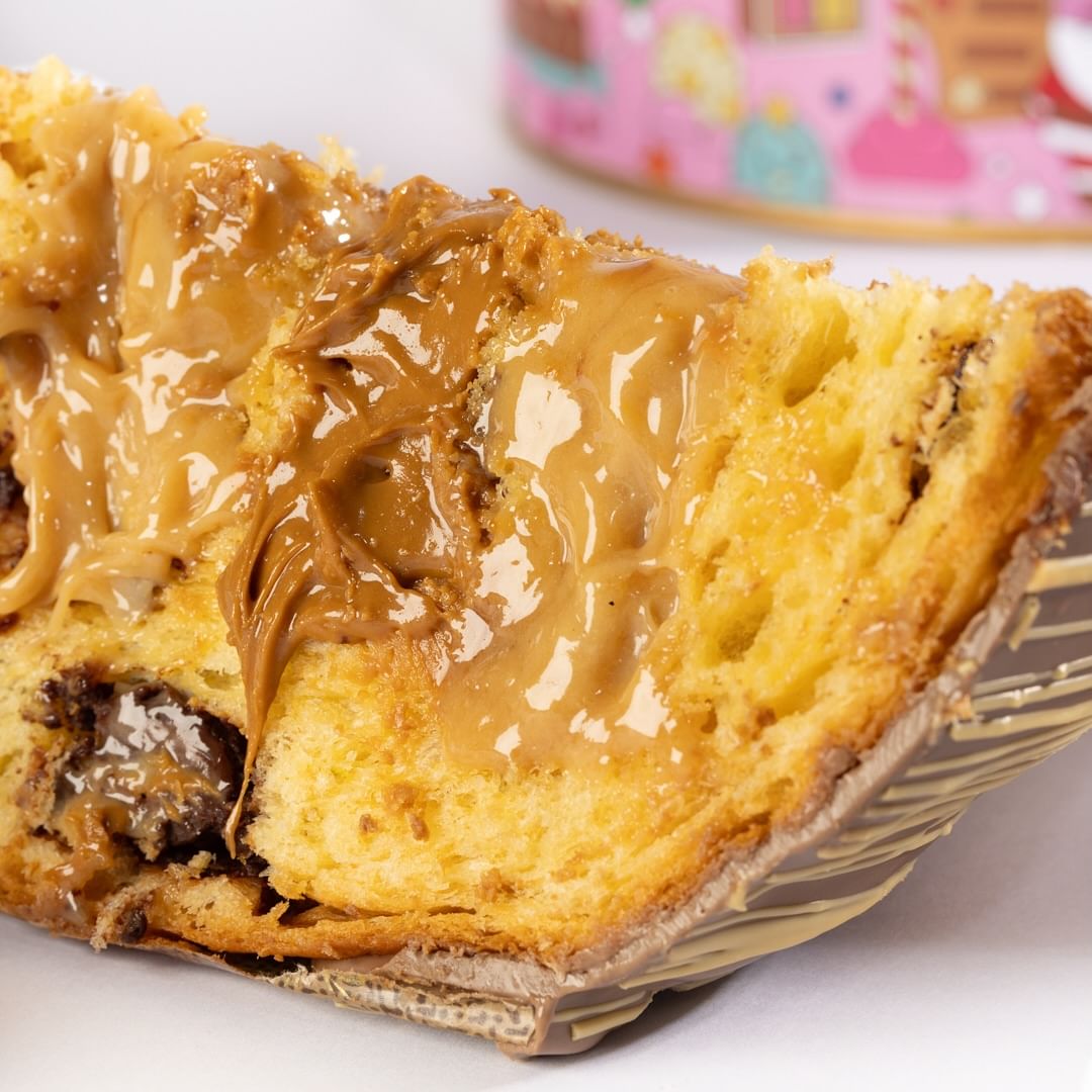 Para quem gosta de opções com bastaaante recheio, é difícil escolher um sabor só. No menu com quatro sabores, o de Speculoos tem nosso coração. Se você não quiser o panetone inteiro, boa notícia: nas lojas e no delivery, é possível pedir apenas a fatia.
