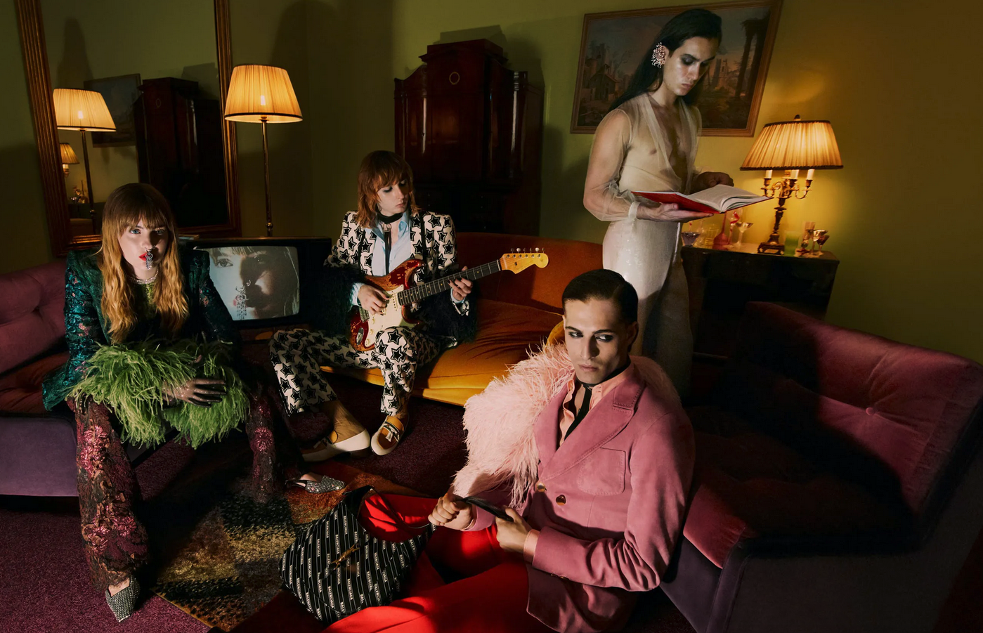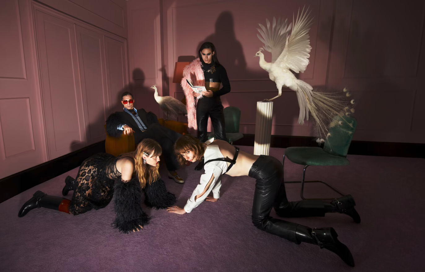 Toques vintages, muito couro e a atitude rock de Måneskin combinaram perfeitamente com a campanha da Gucci. Não à toa, no clipe “I Wanna Be Your Slave”, a primeira faixa original da banda, o quarteto está todo vestido com a marca – ternos florais, vestidos rosa tafetá, lingerie de renda preta e, claro, uma jaqueta de couro.