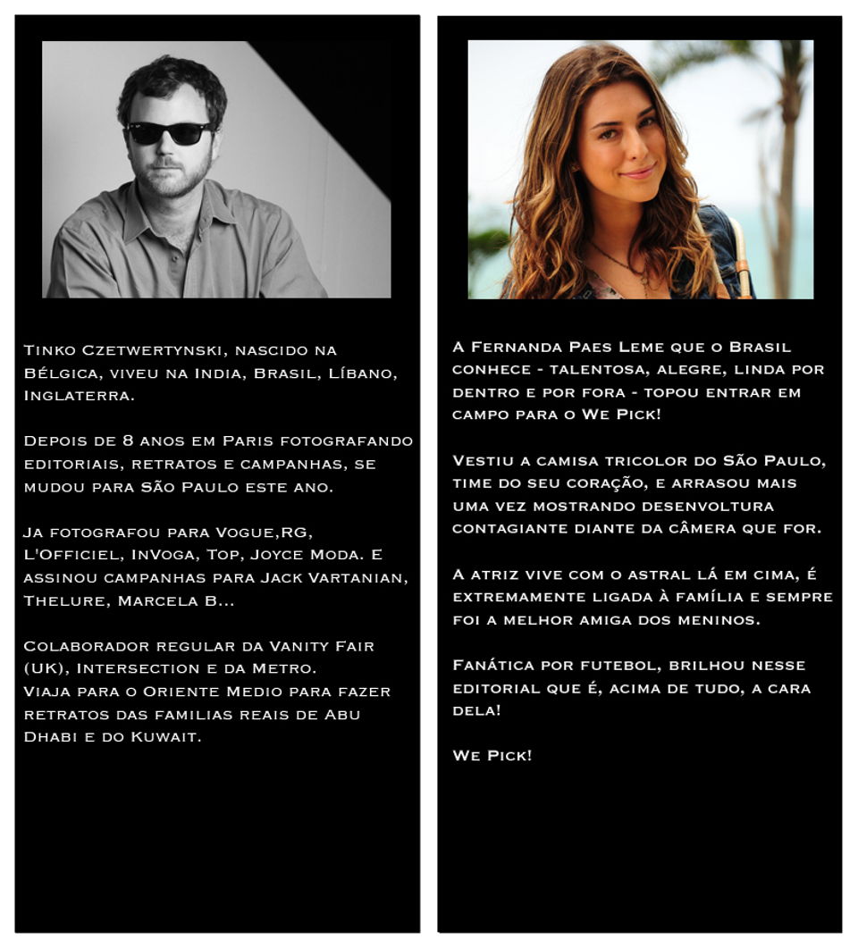 Enquanto se prepara para o papel na próxima novela das nove Salve Jorge - a atriz São Paulina roxa - Fernanda Paes Leme deu um break nas gravações para posar com exclusividade para o We Pick! As fotos foram feitas na escola de futebol High Soccer em São Paulo no melhor mood esportivo. Alto astral total, assim como ela! Fotos: Tinko Czetwertynski Styling: Flavia Brunetti