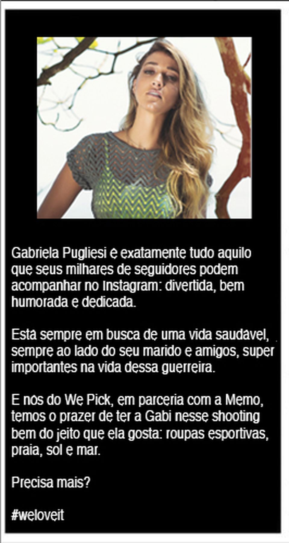 Fotografamos a super blogueira de fitness Gabriela Pugliesi no ambiente que ela mais gosta: a praia! Os looks foram produzidos com as peças da linha especial que ela desenvolveu para a marca esportiva Memo.
